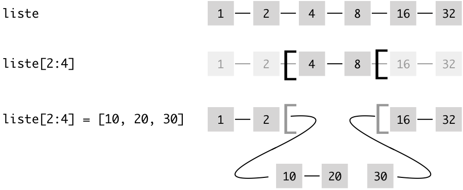 liste[1, 2, 10, 20, 30, 16, 32]Voici une représentation imagée de ce qui se passe lorsqu’on exécute cette dernière ligne de code; cela revient en quelque sorte à remplacer la slice à gauche de l’affectation (ici liste[2:4]) par la liste à droite de l’affectation (ici [10, 20, 30] - ce qui a, en général, pour effet de modifier la longueur de la liste.