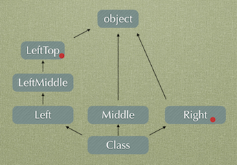 instance.attribut() == 'attribut(LeftTop)'TrueExercice : Remarquez qu’ici Right a elle-même un héritage très simple. À titre d’exercice, modifiez le code ci-dessus pour faire que Right hérite de la classe LeftMiddle ; de quelle classe d’après vous est-ce que Class hérite attribut dans cette configuration ?