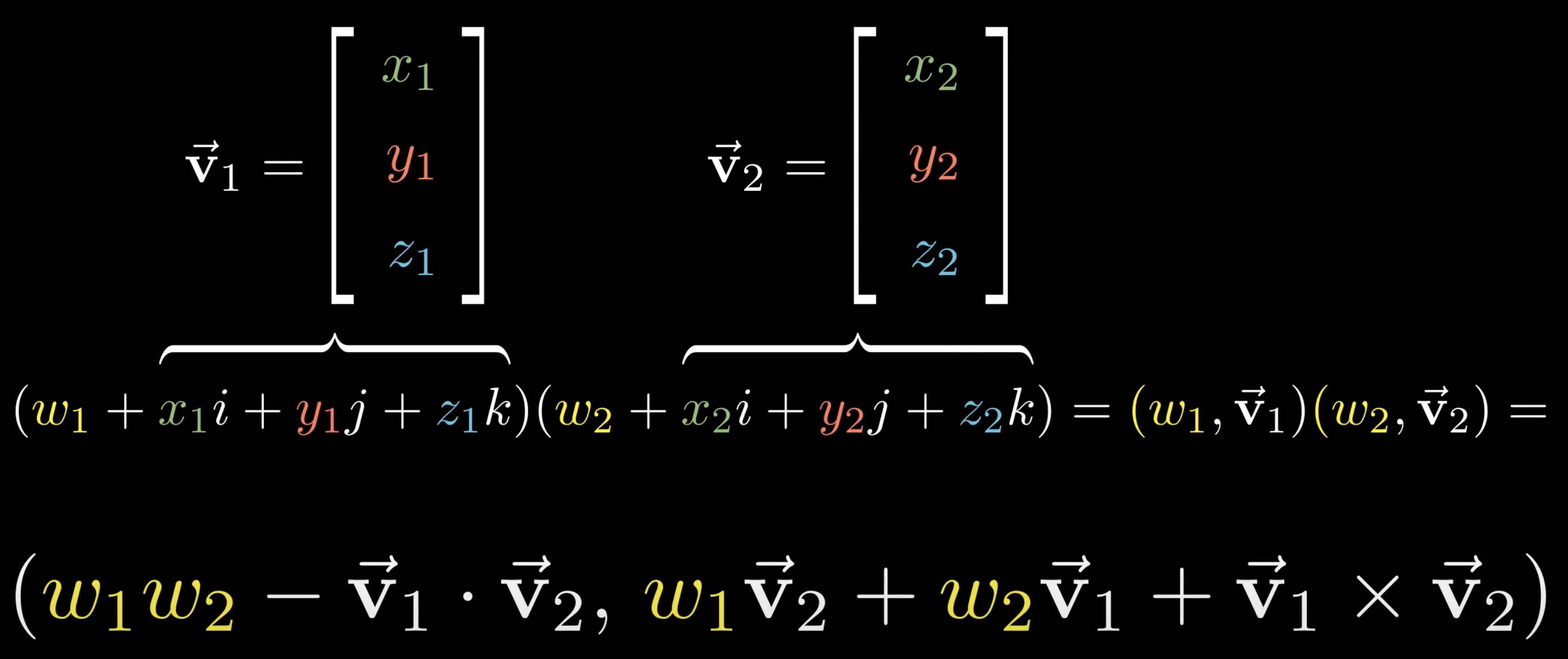TypeError: Quaternion.__init__() missing 3 required positional arguments: 'b', 'c', and 'd'...Ellipsiscomme exercice, vous pouvez aussi vous amuser à vérifier l’identité suivante (extraite de cette vidéo de 3blue1brown)