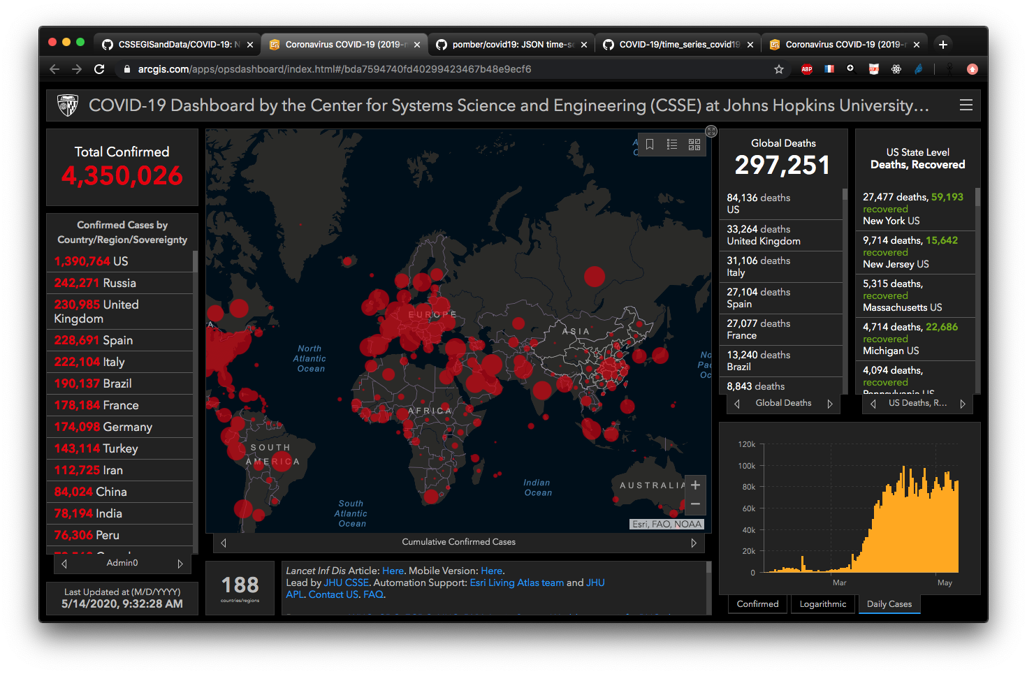 official_url = "https://github.com/CSSEGISandData/COVID-19"Le README mentionne aussi un dashboard, qui permet de visualiser les données en question. Il me semble que l’URL change tous les jours au fur et à mesure des updates, mais voici une capture d’écran pour donner une idée :